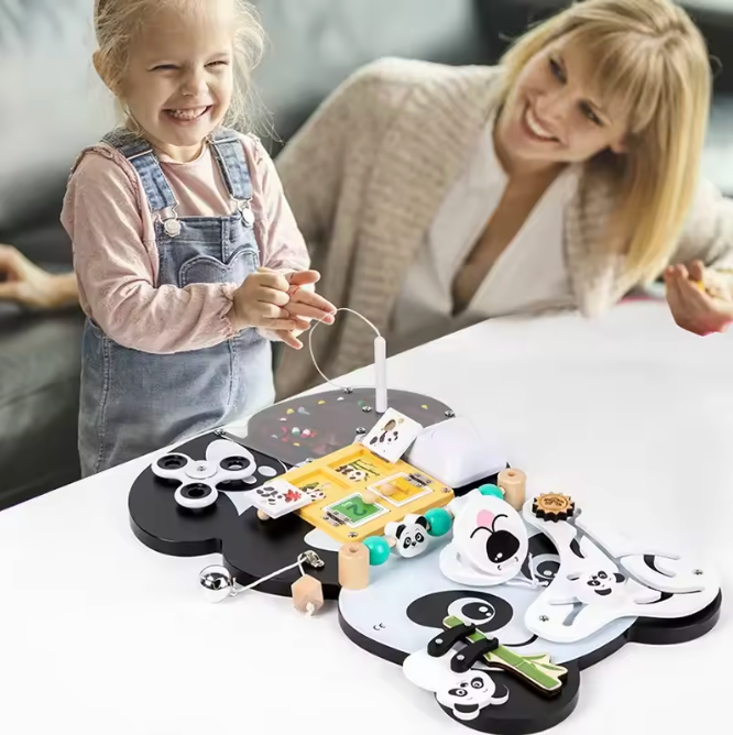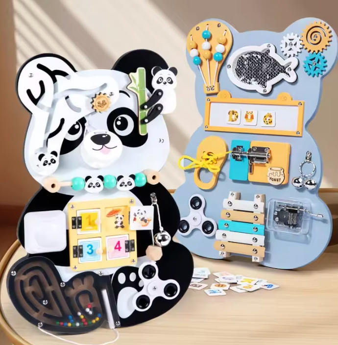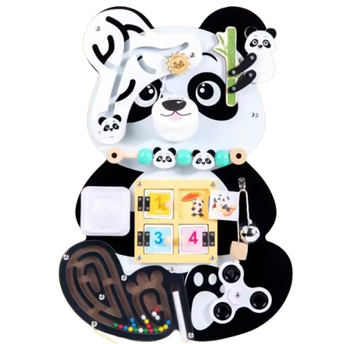 The Busy Board "Curious Bear" is designed to promote learning through play, inspired by the Montessori methodology. This engaging activity board allows children to safely explore essential life skills such as tying shoelaces, zipping zippers, and unlocking latches, fostering independence and confidence.